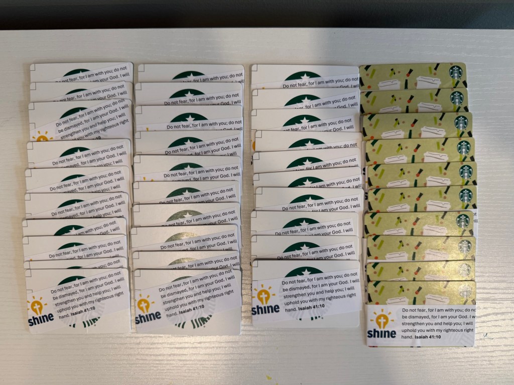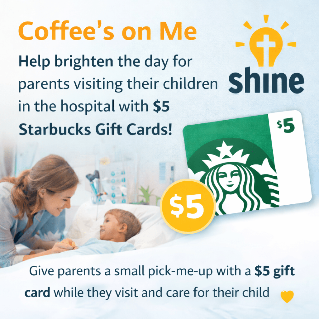 This year we kicked things off with Coffee’s on Me. We collected $5 Starbucks gift cards to be given out to the parents staying at the Ronald McDonald House. They are constantly running back and forth to the hospital so this is a little pick me up and a simple way to show God’s love. Cooper has a Starbucks right in their lobby so they can grab a quick drink on their way in. We were able to collect 122 got cards! That’s amazing! Stay tuned to see when we give them out!